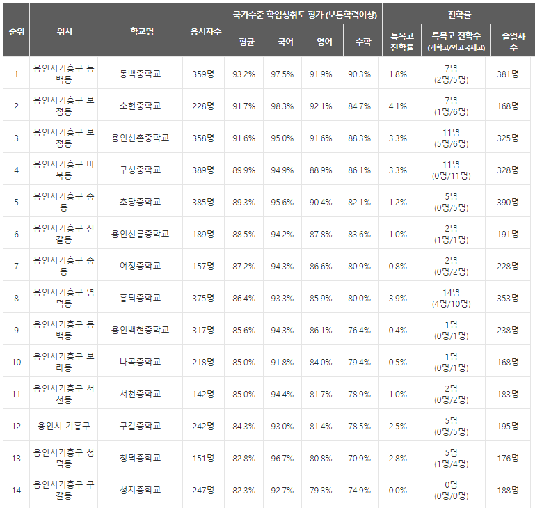 ▣ 경기도 용인시 기흥구 중학교 순위 (특목고 진학률)