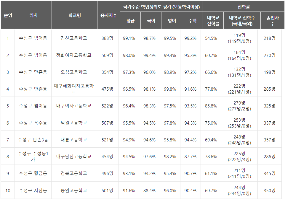대구 수성구 고등학교의 학업성취도 순으로는