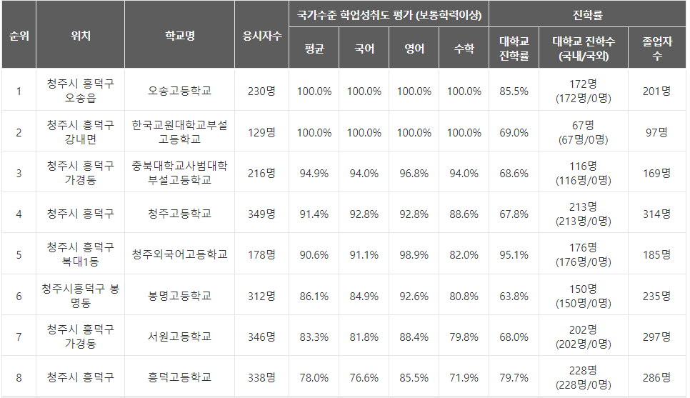 충청북도 청주시의 흥덕구에 위치한 고등학교의 학업성취도 순으로는